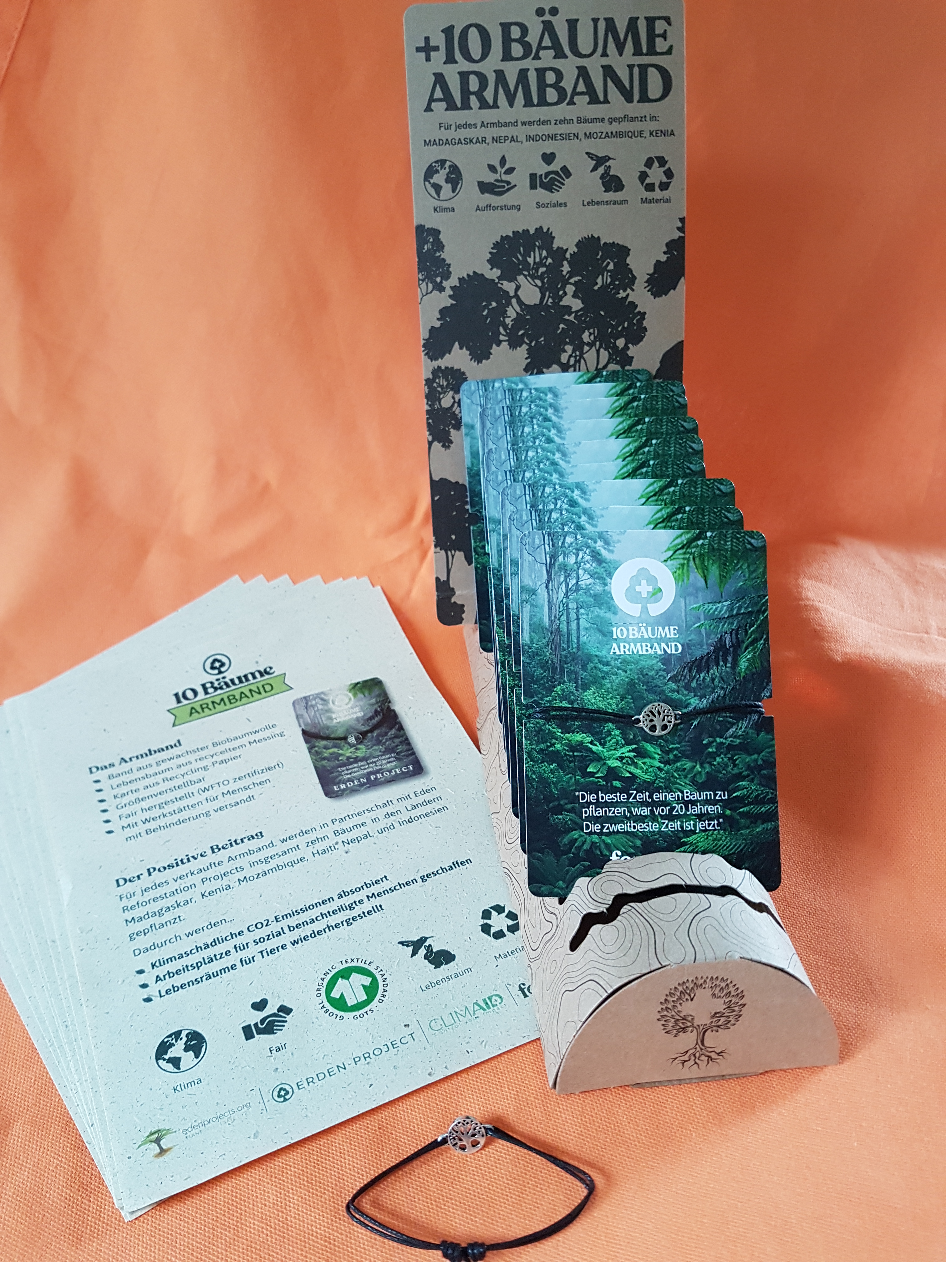 Für jedes verkaufte Armband werden in Partnerschaft mit Erden Reforestation Projects insgesamt 10 Bäume in den Ländern Madagaskar, Kenia, Mozambique, Haiti, Nepal und Indonesien gepflanzt.
